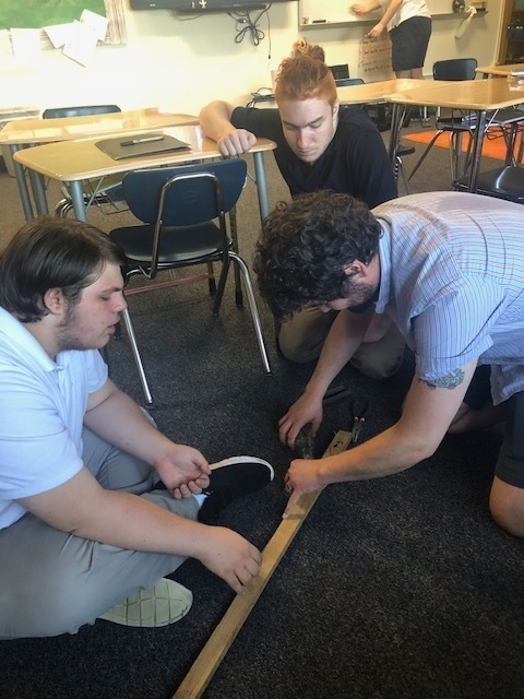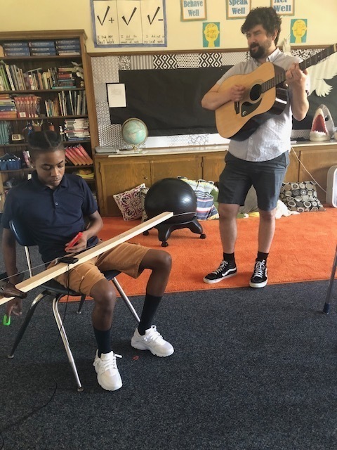 Students worked in pairs after learning about the blues to construct their own diddley bow. With the assistance of a "pick up," students were able to electrify and amplify their bows to hear how similar they sound to modern guitars. Students learned traditional blues rhythm, AAB pattern and could keep up with songs such as I am a Man by Muddy Waters and Bad to the Bone by George Thorogood.