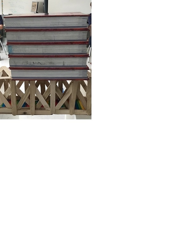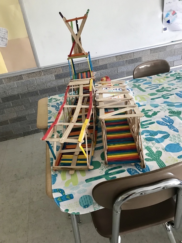 7th grade students at School 53 used only Popsicle (160) sticks and hot glue to complete an engineering challenge and create a bridge that could hold weight. The photos show the completed bridges and the weight bearing contest. The bridge pictured holding large textbooks held a little more than 25 pounds! #FalkForward #sgfpride #FalkFun